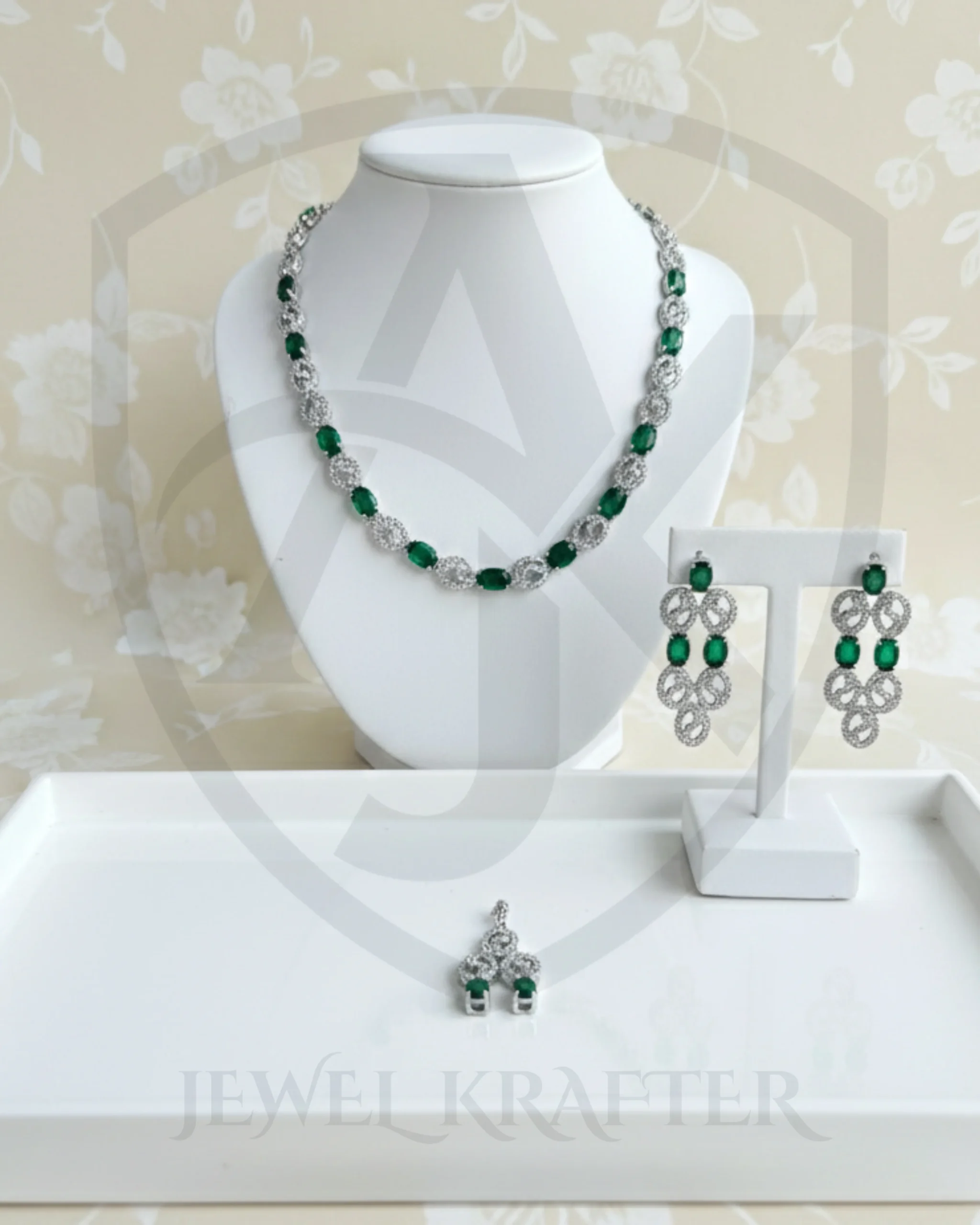 This complete set offers a perfect blend of modern design and classic emerald charm. Dainty infinity loops with green stones add graceful movement and sparkle to your style.