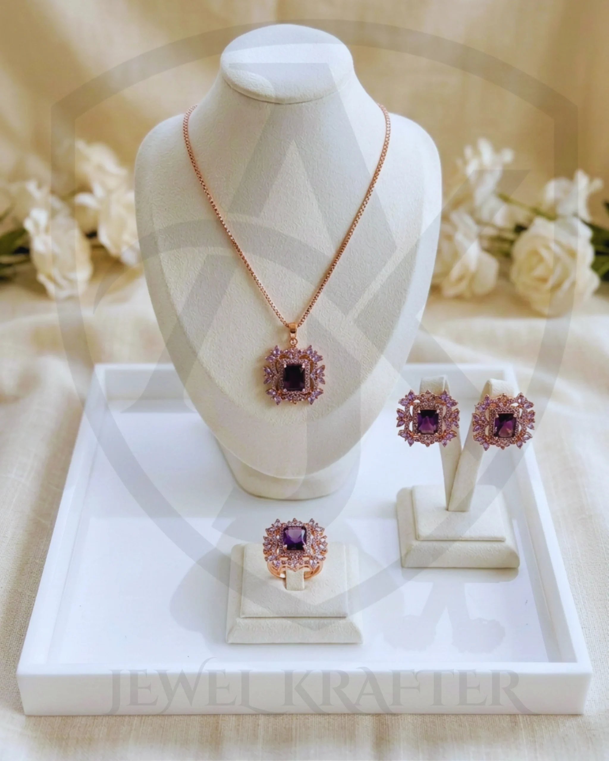Featuring cushion cut plum stones encircled by shimmering lilac and clear crystals, this coordinated set delivers luxurious sparkle and a soft, romantic glow, perfect for mehndi, baraat, or reception looks.