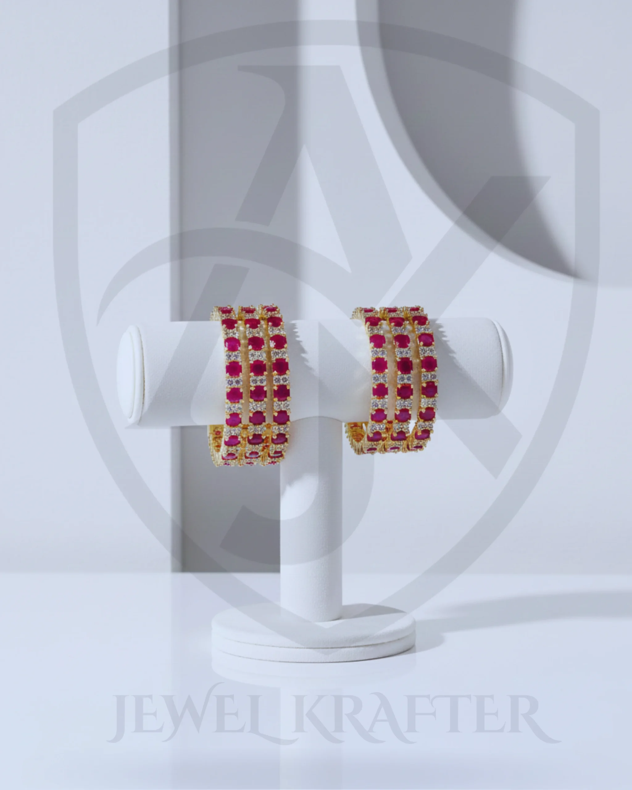 These luxurious bangles feature radiant ruby red stones set in a rich gold tone design. Perfect for weddings and festive occasions, they add a regal charm to any outfit.