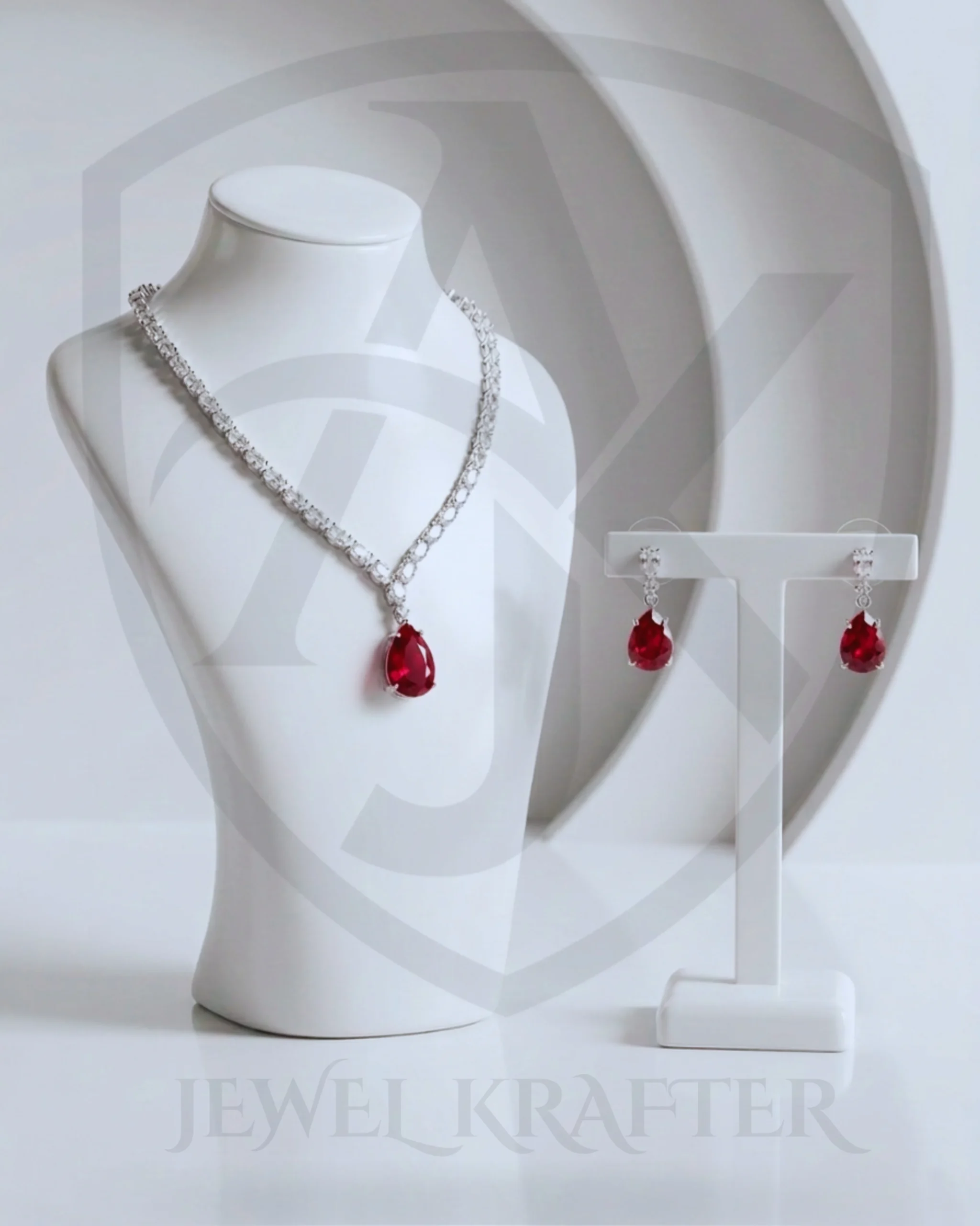 Fiery ruby red teardrops hang from crystal studded silver settings, creating a striking contrast of ice and fire. The coordinated necklace and earrings instantly elevate any formal or bridal look.