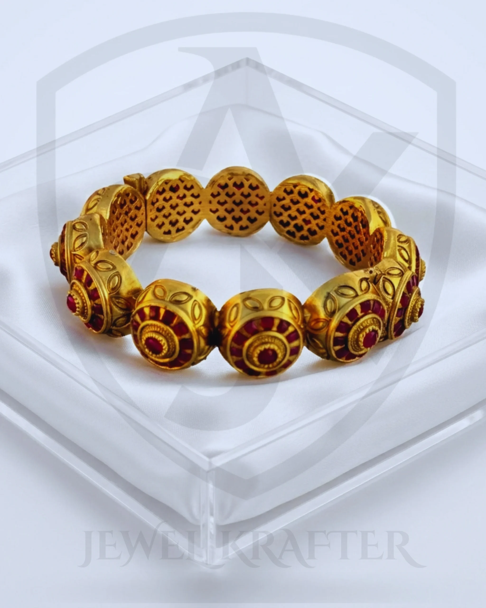 Each hand engraved gold disc tells a story of exceptional artistry bold ruby cabochon centers, intricate leaf engravings, and delicate heart lattice links combine for an unforgettable statement piece.