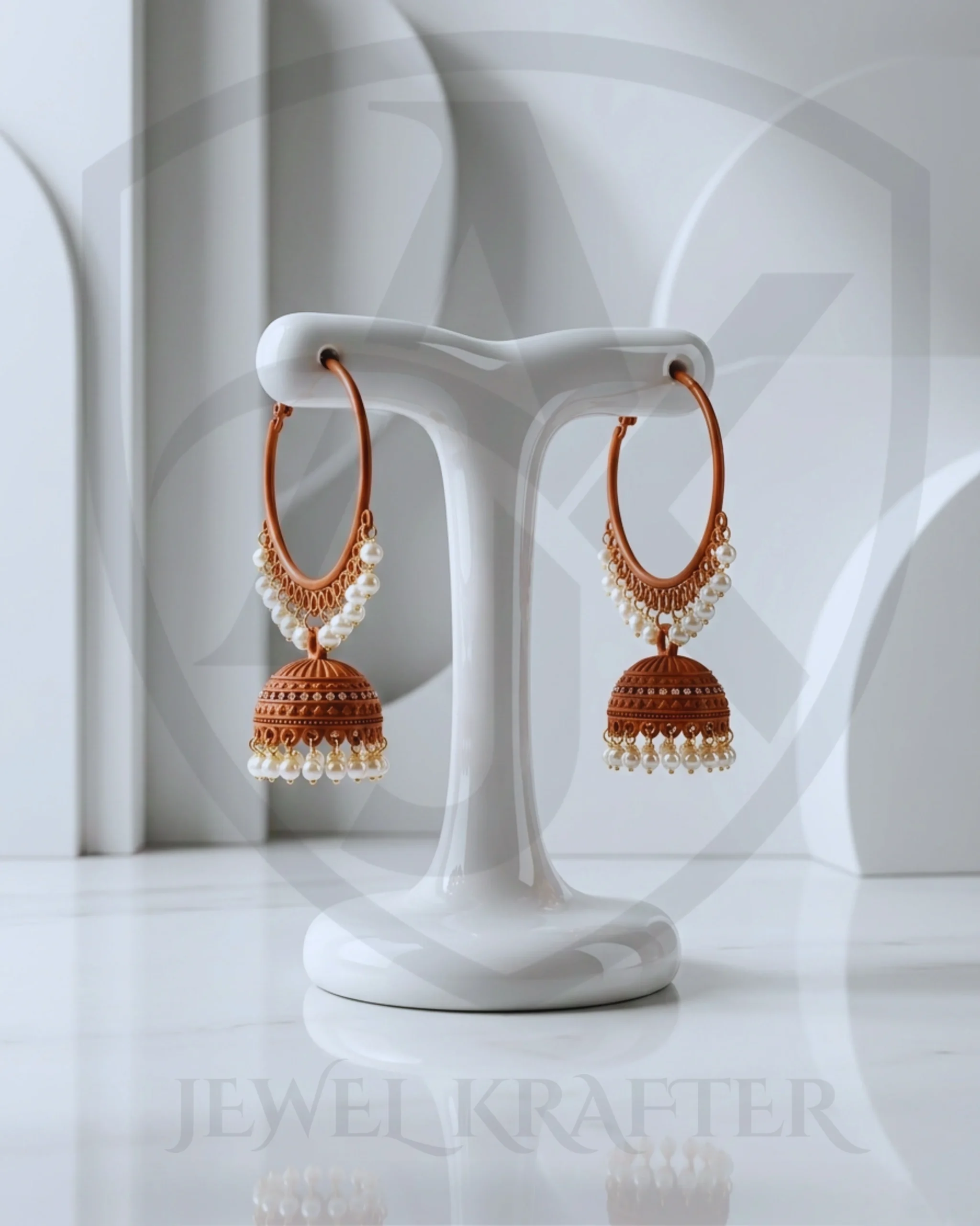 Detailed rust brown domes hang from sleek hoops, finished with dangling pearl beads that add gentle movement and a touch of sophistication.