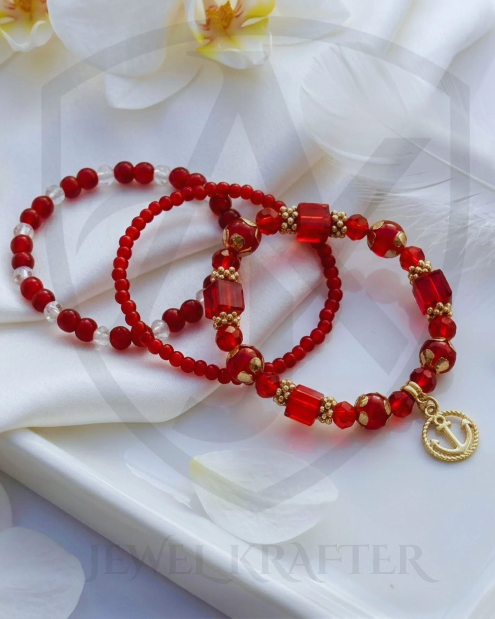 Bold red beads, faceted crystals, and luxe gold accents create a striking three piece bracelet stack, anchored by a statement charm bracelet for instantly elevated style.