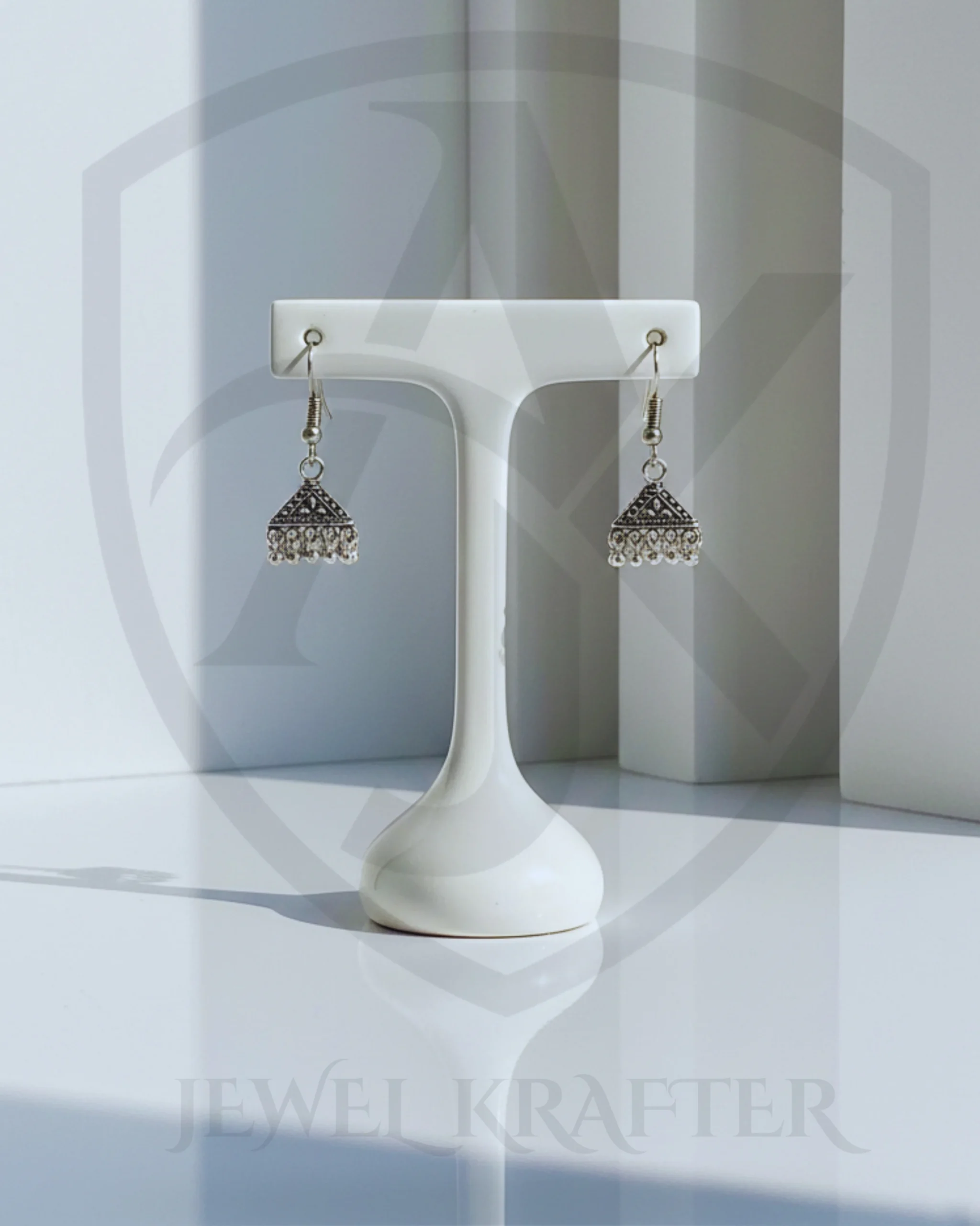 Dainty oxidized silver triangle jhumkas with intricate etching and tiny pearl‑style beads, perfect for everyday ethnic wear.