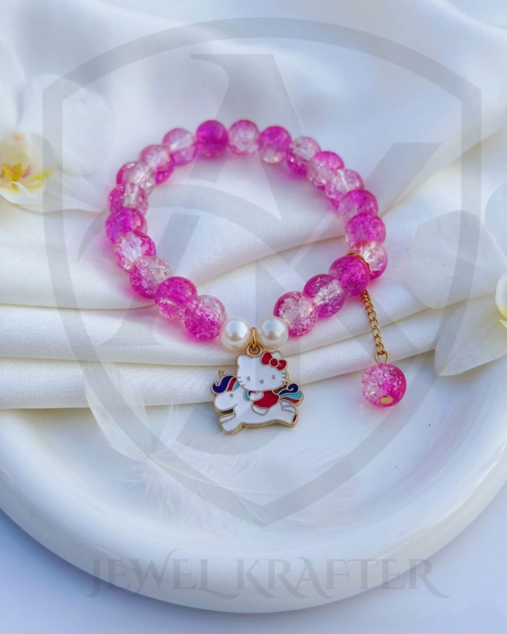Designed for tiny princesses, this lightweight bracelet combines glittery pink beads with pearl accents and a sweet unicorn kitty charm for a magical finishing touch.