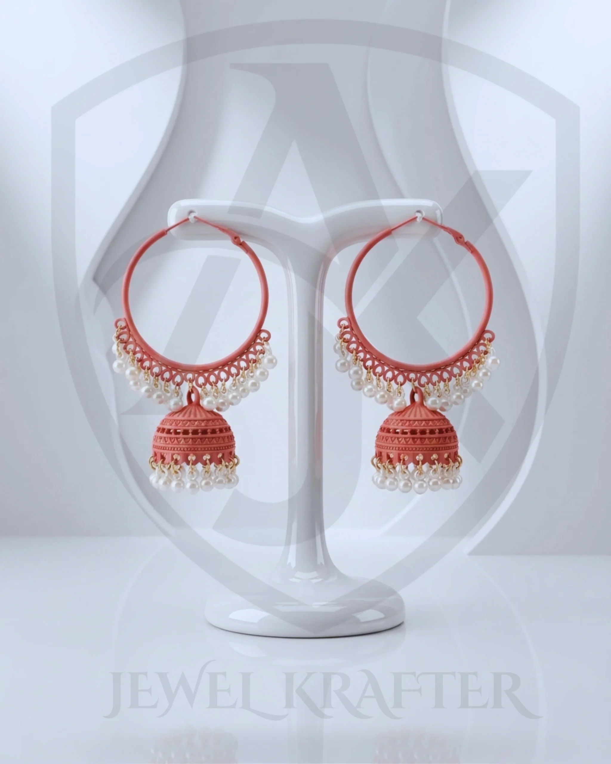 Rich sunset‑coral domes, detailed with fine traditional patterns and framed by luminous pearls, create a regal statement for weddings and special occasions.
