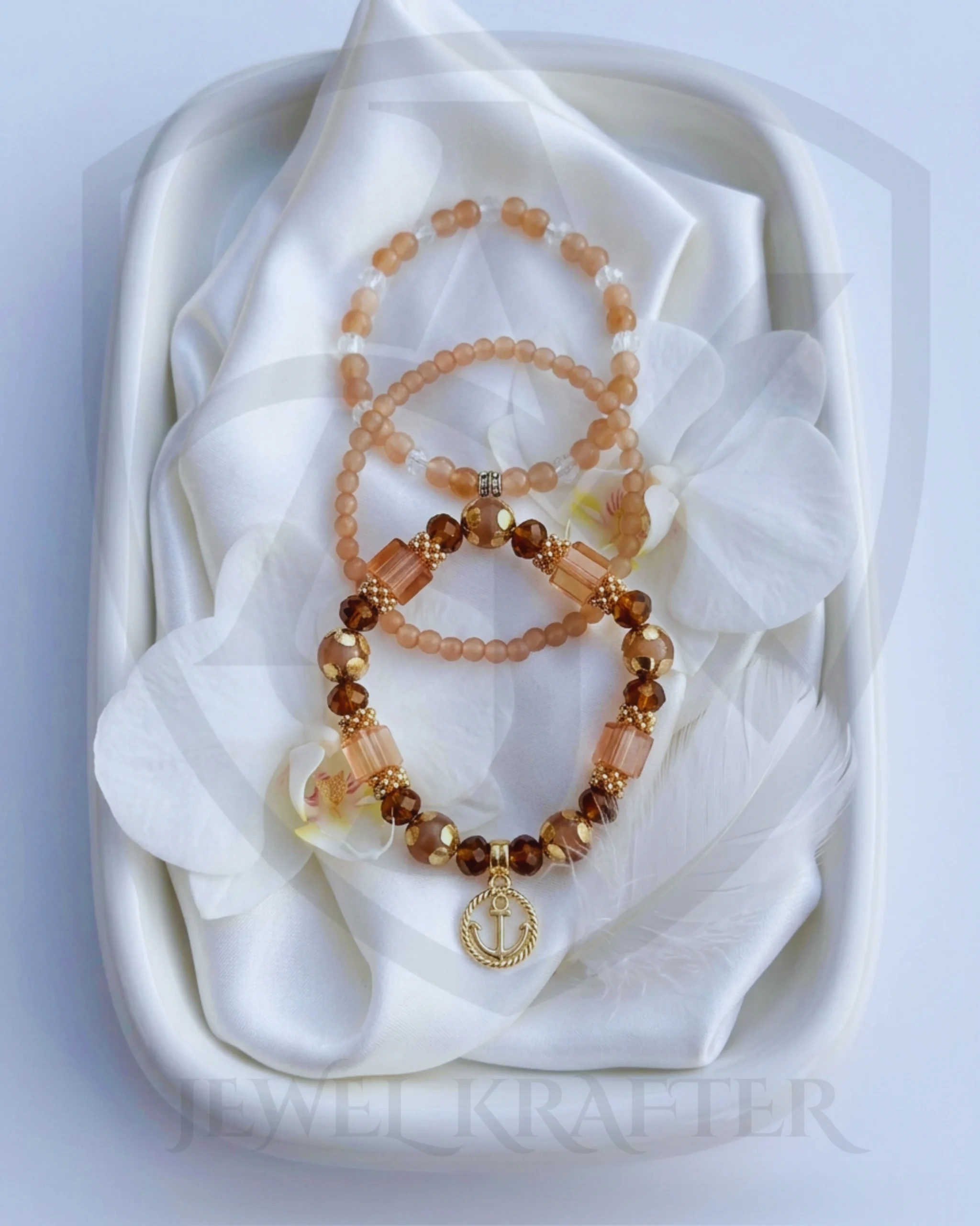 Inspired by soft sunset hues, this set includes a detailed charm bracelet with shimmering brown crystals plus two slim nude bracelets, creating a refined, feminine wrist stack.
