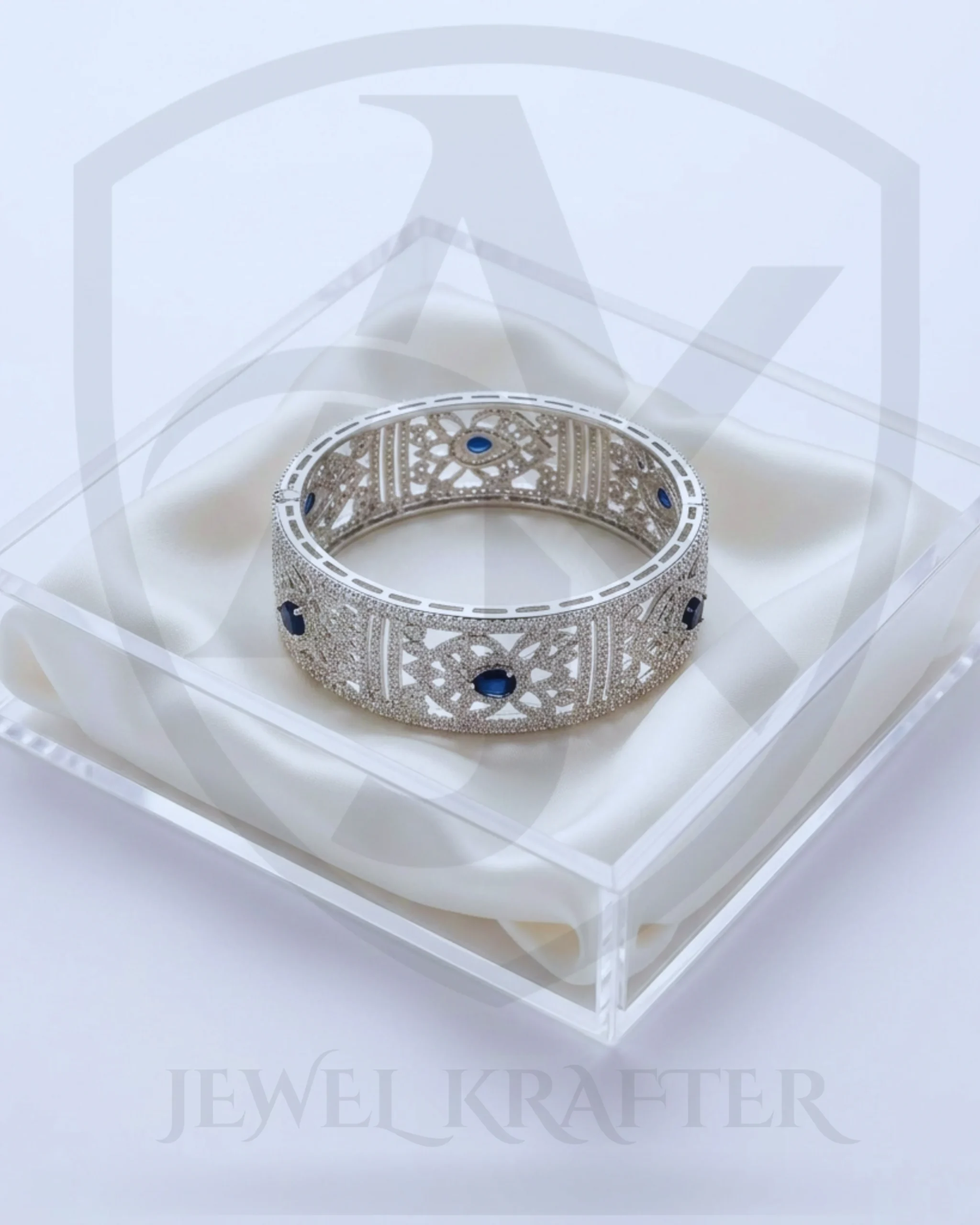 Inspired by ancient architectural grandeur, this magnificent wide-cuff bangle showcases a stunning diamond-encrusted lattice design with bold sapphire centerpieces for a truly regal wrist statement.