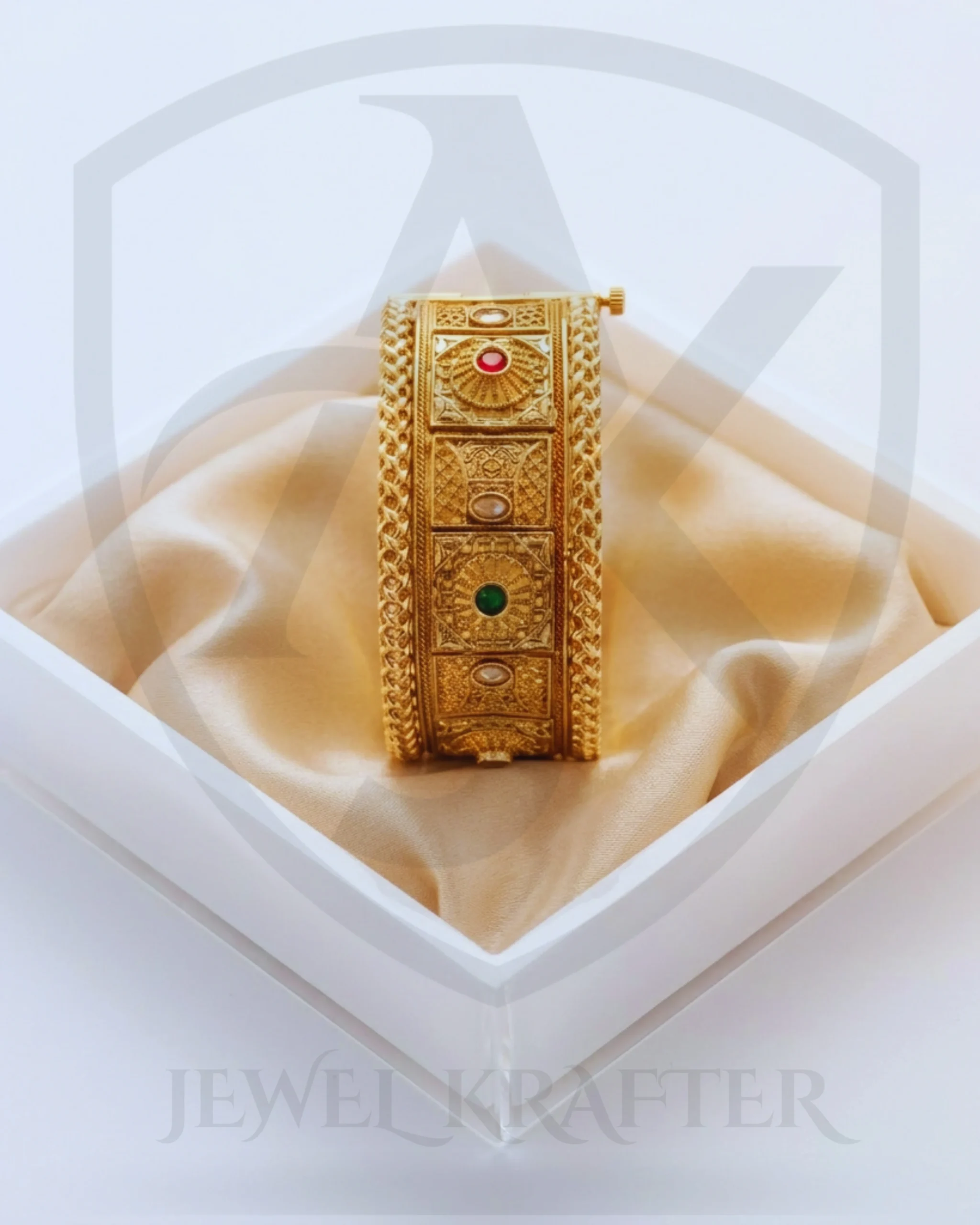 Inspired by Mughal architectural grandeur, this striking Ganga Jamuni kada set features deeply engraved geometric panels, alternating gemstone cabochons, and elaborate textured borders in timeless dual tone gold and silver.
