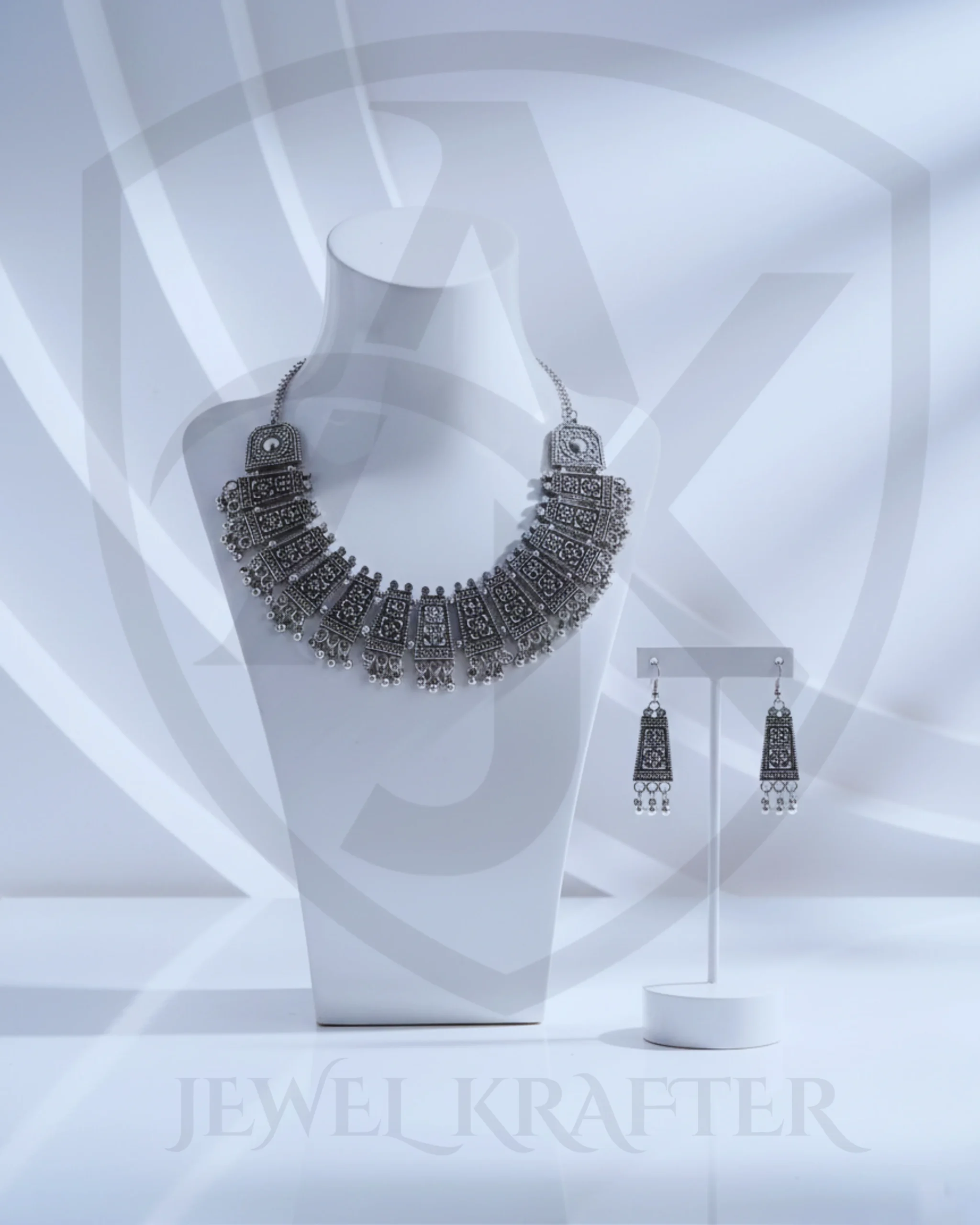 A bold oxidised silver choker with structured panels and intricate tribal motifs, paired with matching long earrings. Perfect for adding statement drama to sarees, kurtis and contemporary fusion wear.