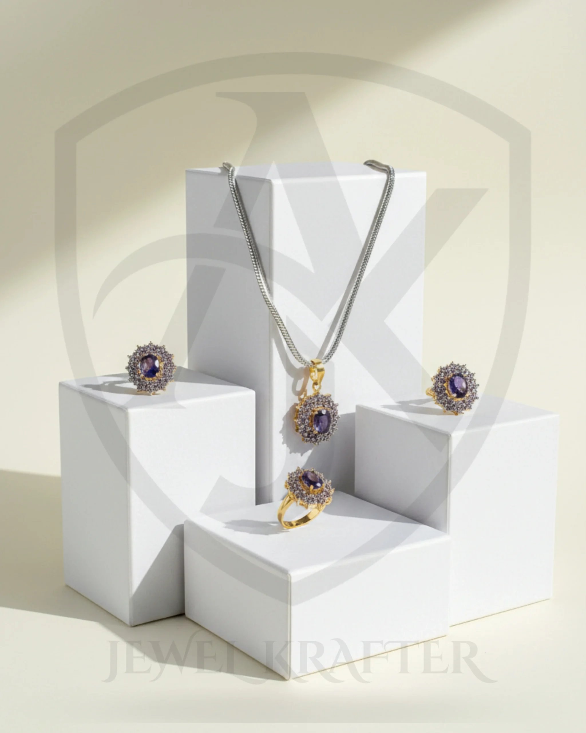 A sleek chain and statement rings make this amethyst set perfect for both eastern and western wear. Each piece catches the light beautifully, adding effortless glamour to any occasion.