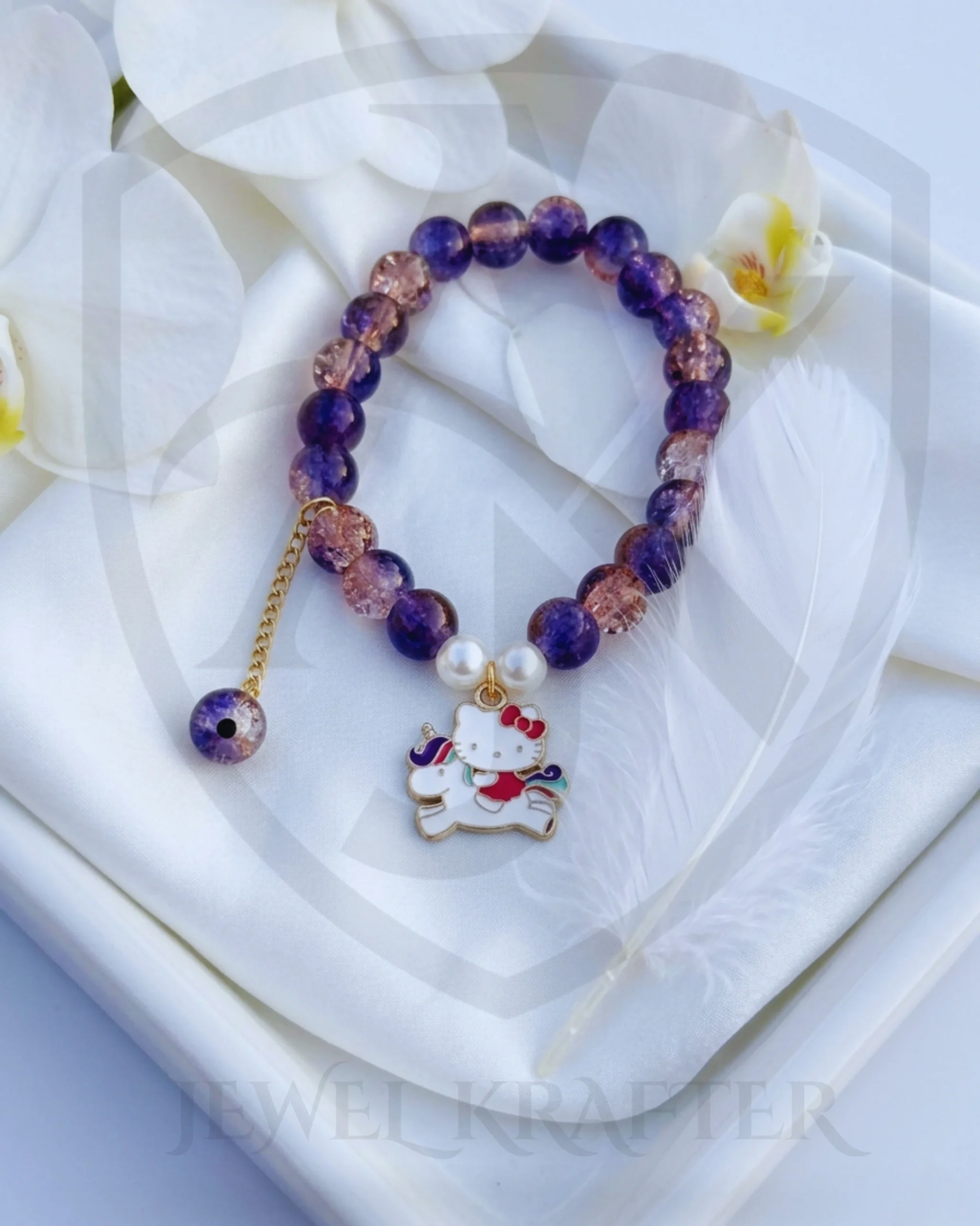 Adorable purple and rose crackle beads paired with glossy pearls and a cute kitty on unicorn charm, perfect for little girls who love all things dreamy and magical.