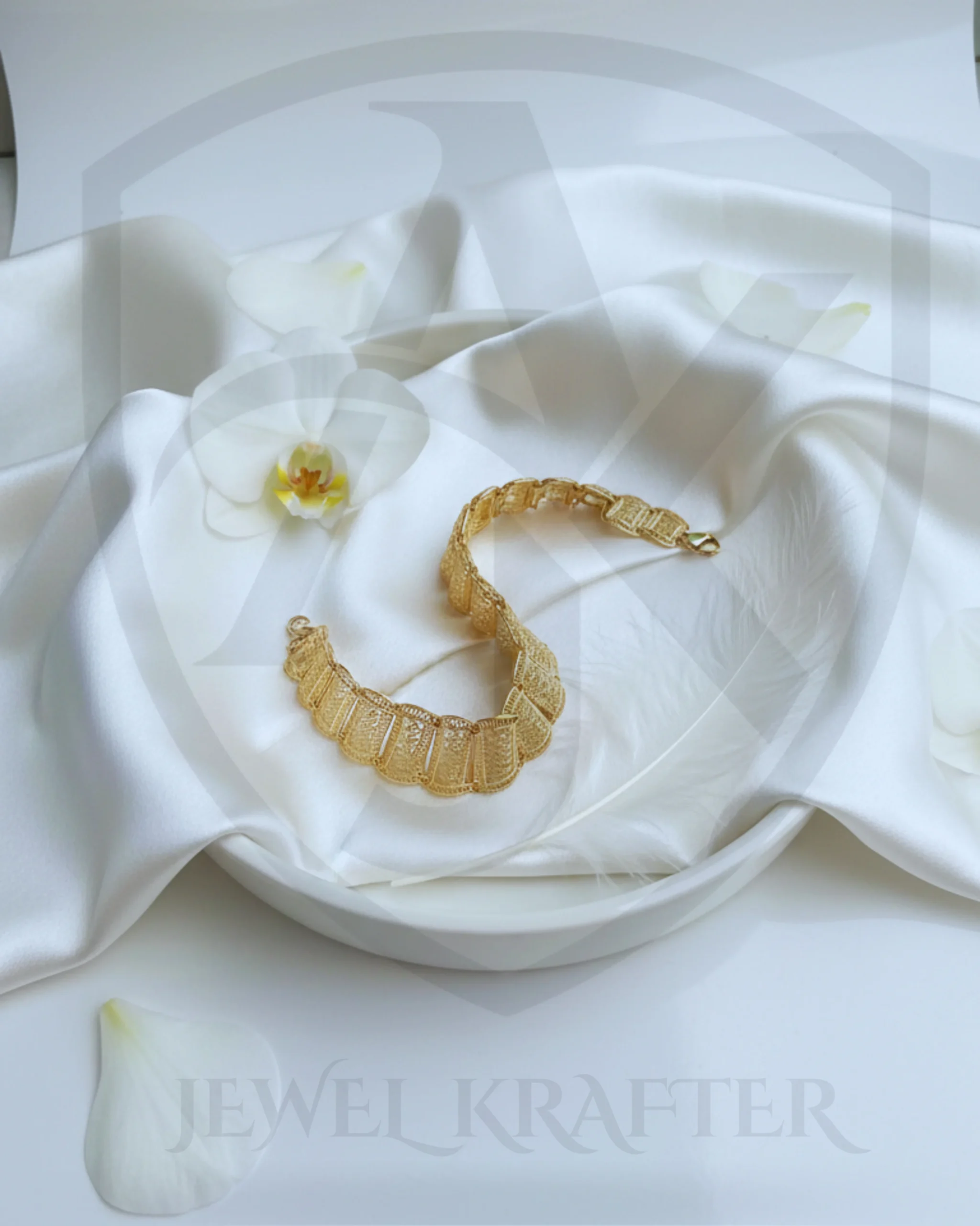 A delicate, lace inspired bracelet in rich gold tone, featuring scalloped edges and intricate filigree work that wraps the wrist with old world charm.