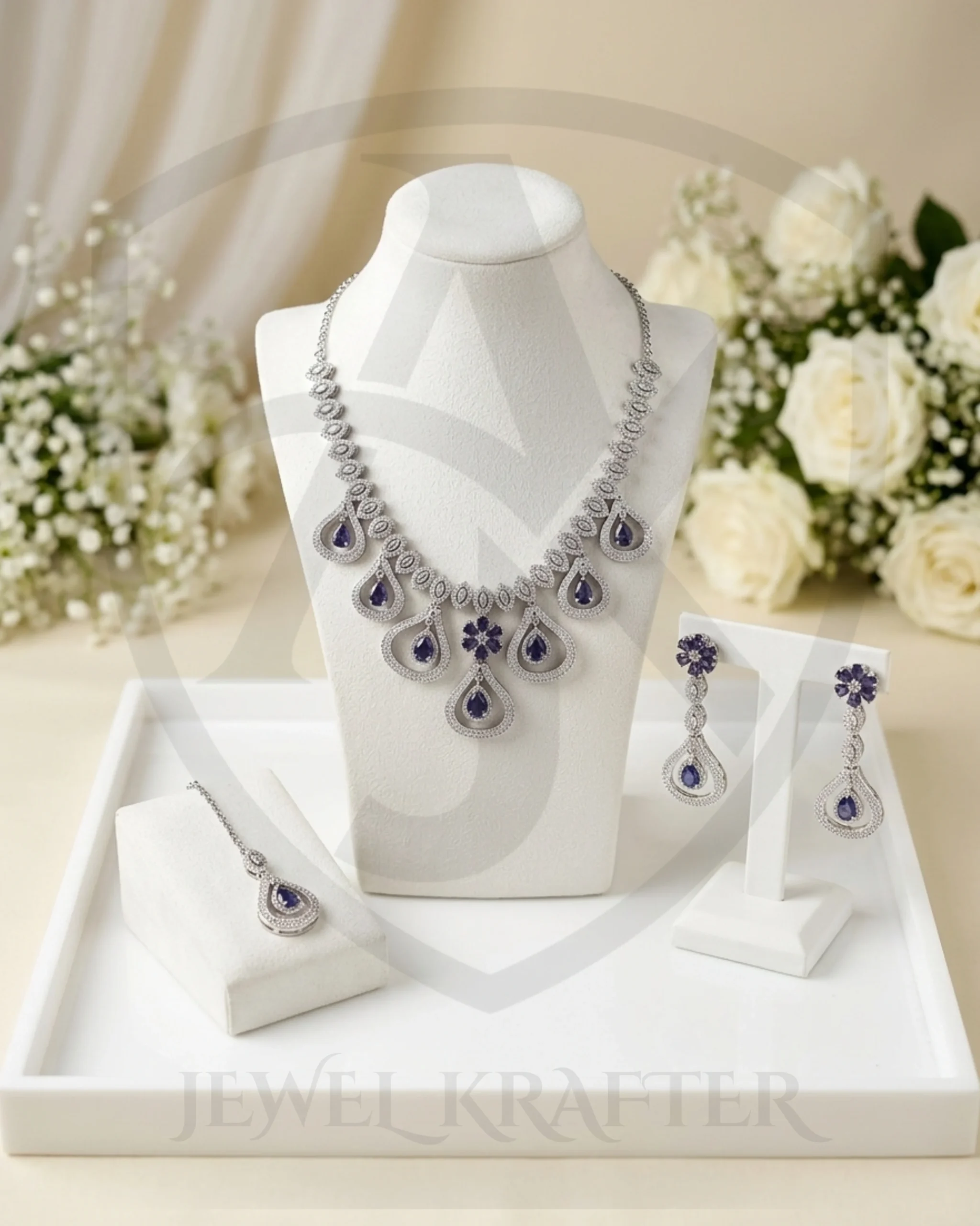 Elegant dewdrop motifs shimmer with lavender accents, adding soft glamour to any evening ensemble.
