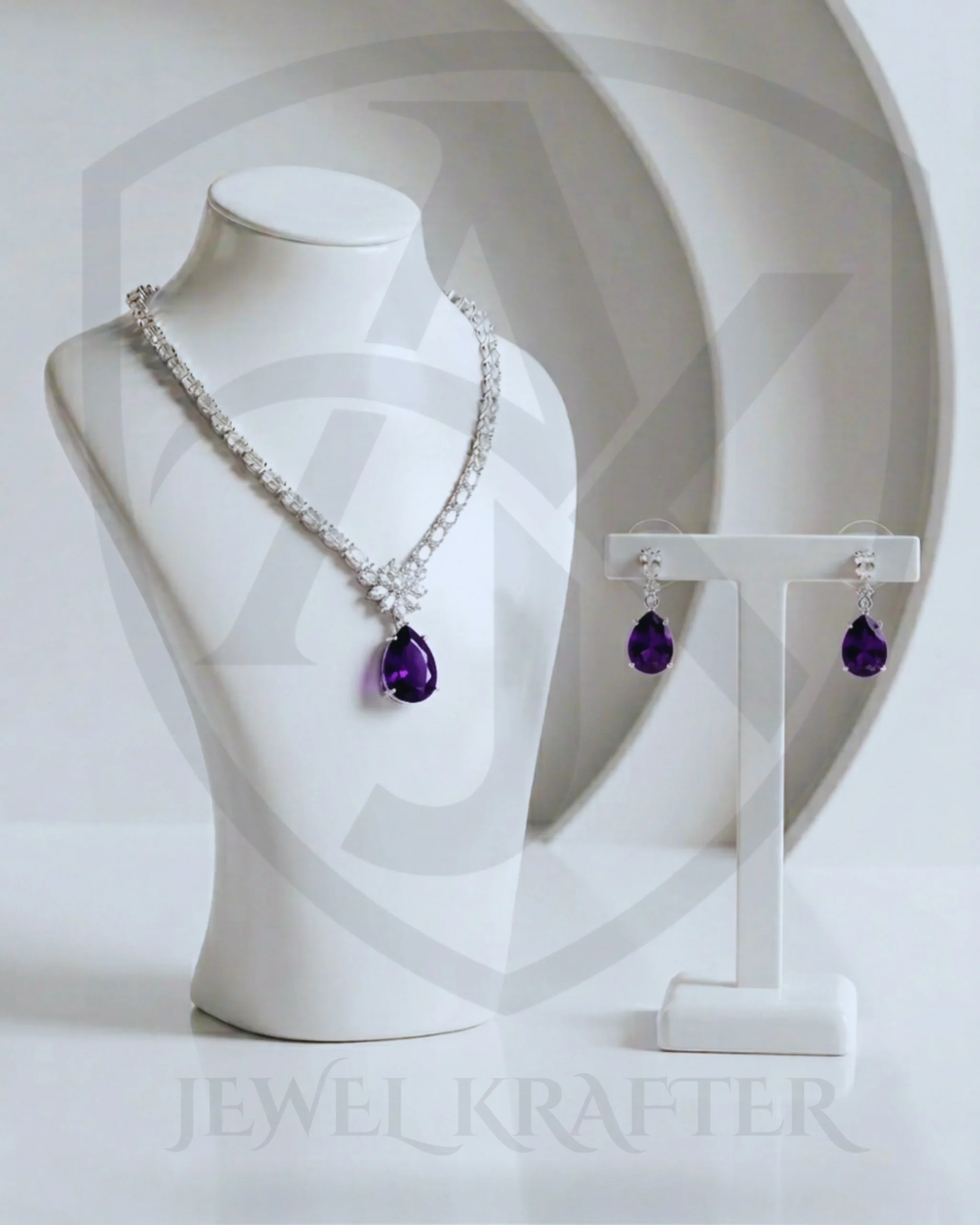 A cascade of precision cut crystals flows gracefully into a bold amethyst centerpiece, complemented by elegant matching earrings. Ideal for bridesmaids or special celebrations needing a touch of timeless sparkle.