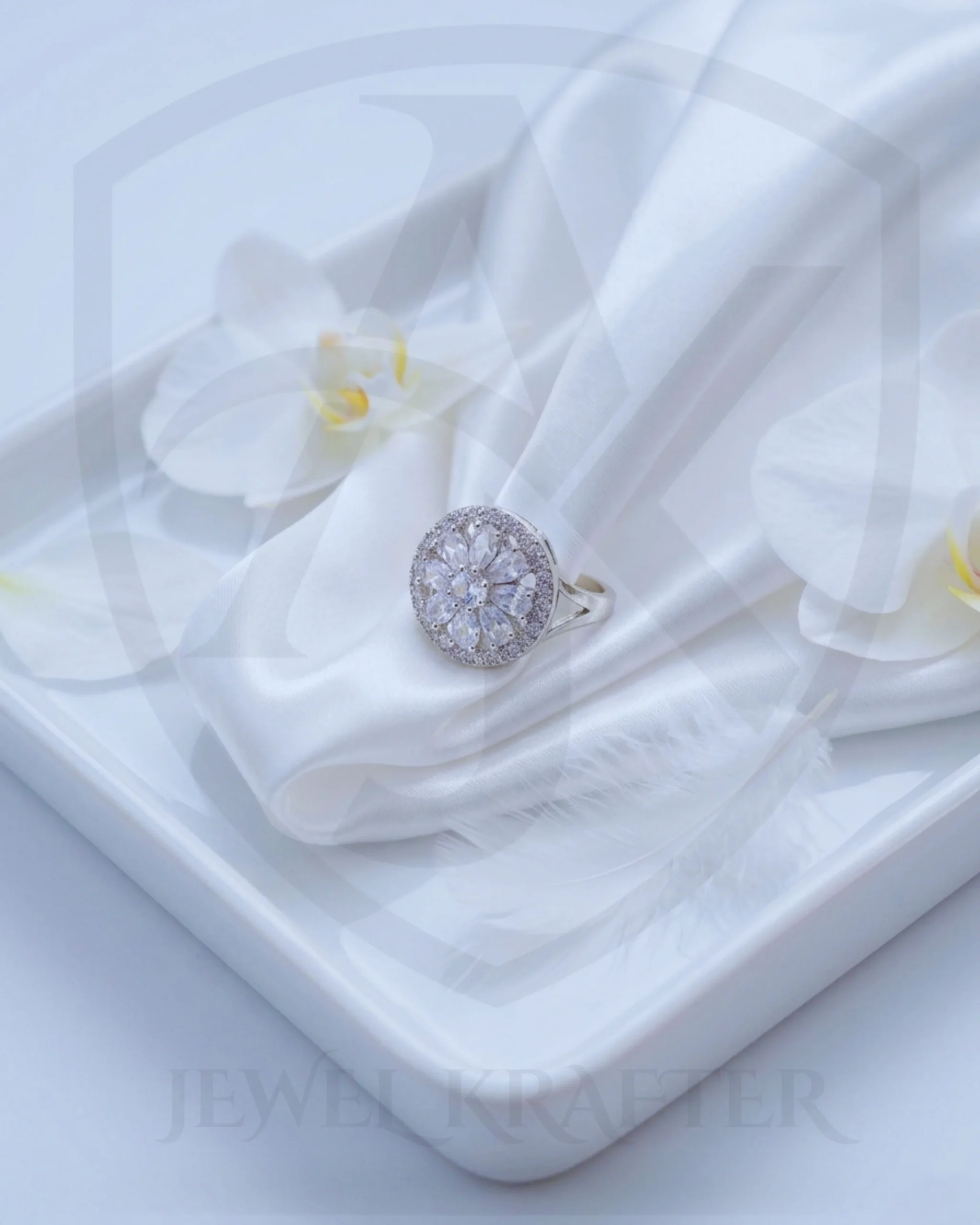 This elegant silver tone ring showcases a stunning rosette of sparkling marquise-cut white crystals beautifully framed by a glittering round pave halo, perfect for bridal or special occasion wear.